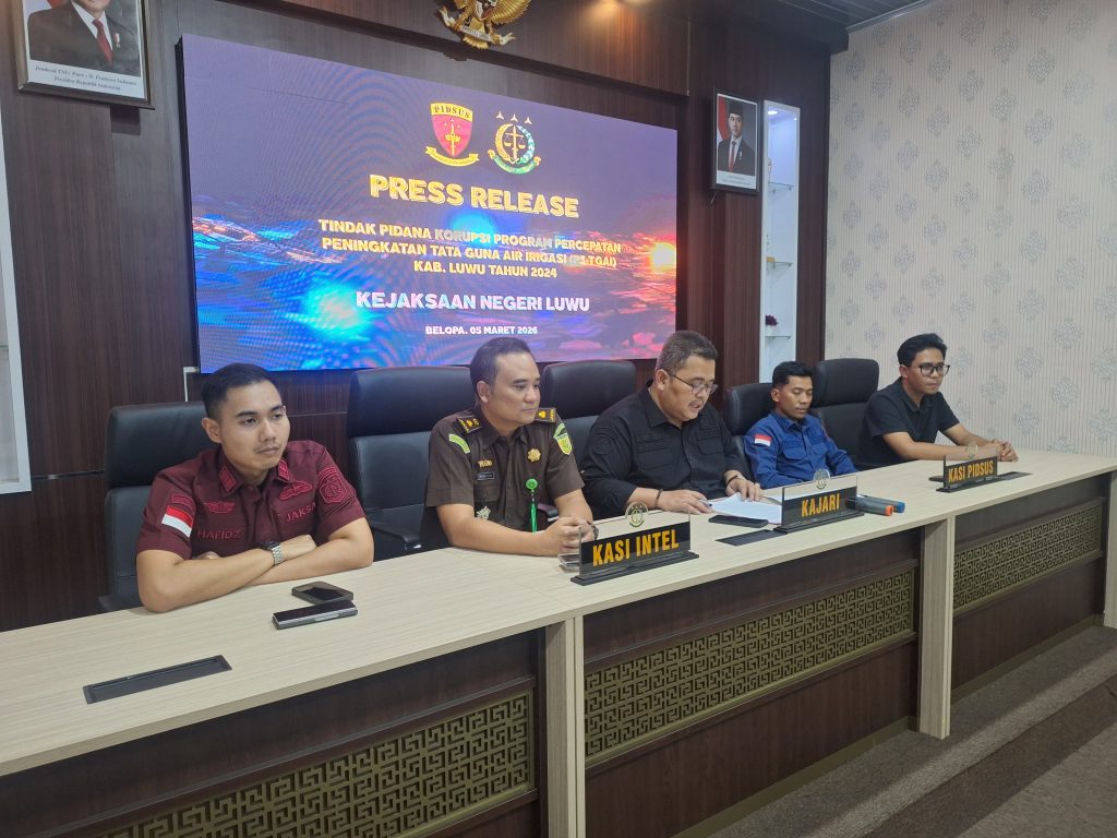 Talinews.com, LUWU — Kejaksaan Negeri Luwu menetapkan lima orang sebagai tersangka dalam perkara dugaan tindak pidana korupsi Program Percepatan Peningkatan Tata Guna Air Irigasi (P3-TGAI) Tahun Anggaran 2024 di Kabupaten Luwu, Sulawesi Selatan. Penetapan tersangka dilakukan setelah penyidik pada bidang tindak pidana khusus melakukan penyidikan berdasarkan Surat Perintah Penyidikan Kepala Kejari Luwu Nomor Print-78/P.4.35.4/Fd.2/01/2026 tertanggal 28 Januari 2026.